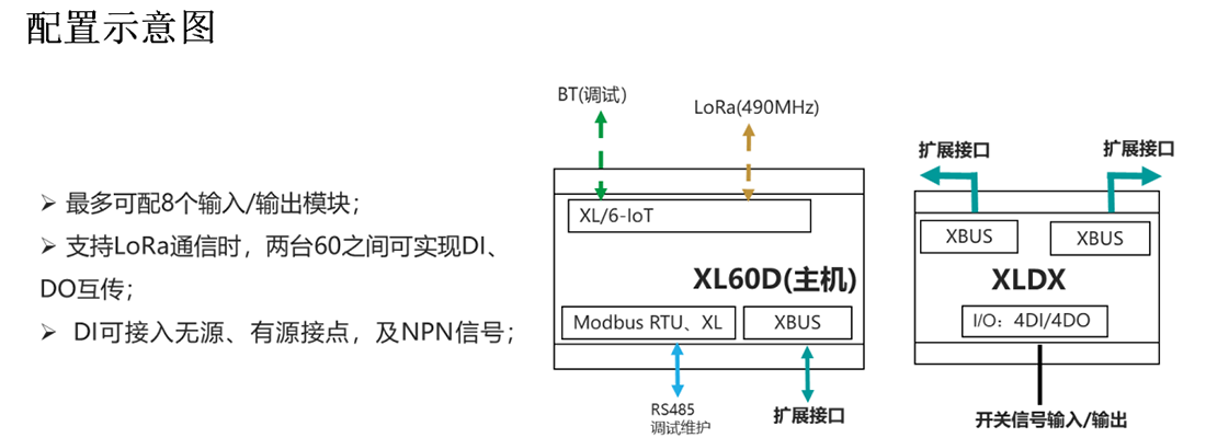 XL60D的通信方式是LoRa無線傳輸方式,每臺XL60D主機模塊,最多配兩個開關(guān)量I/O模塊。