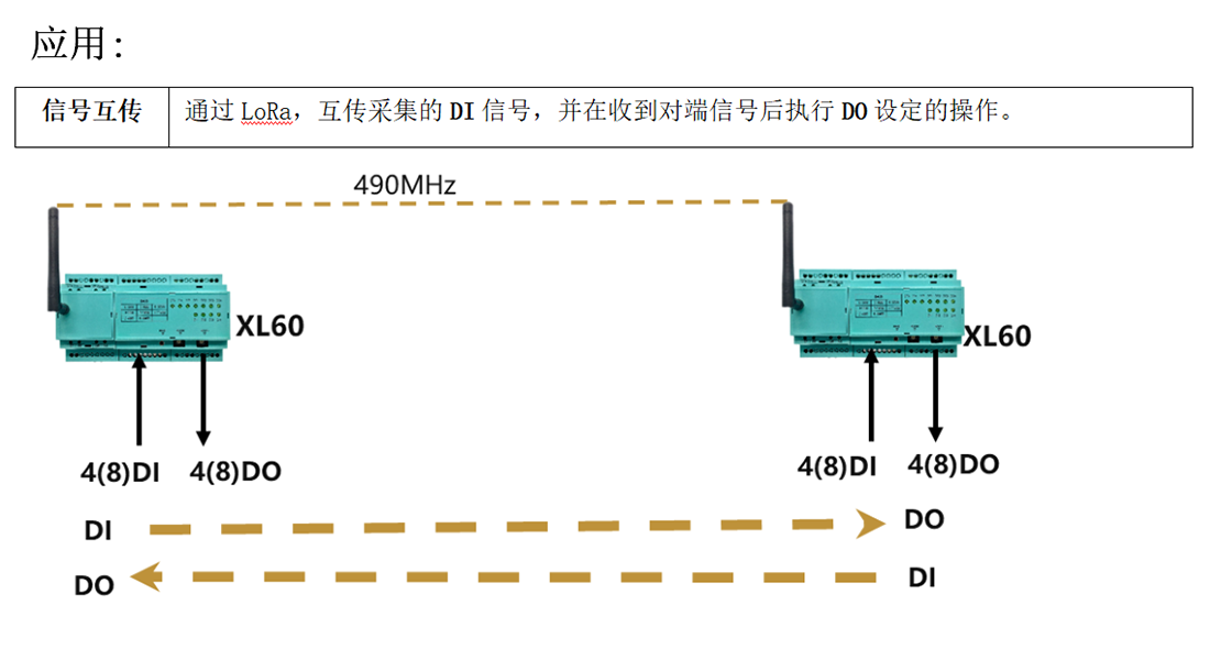 無線開關(guān)量對傳模塊XL60D,由一對XL60D采集模塊組成,從一端模塊輸入的開關(guān)信號,無線對傳到另一端輸出開關(guān)信號。開關(guān)信號是一對一的輸入、輸出,DO隨著對應(yīng)DI的變化而變化。