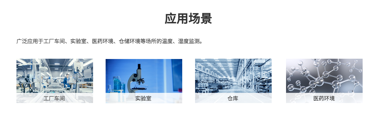 工廠車間、實(shí)驗(yàn)室、醫(yī)藥環(huán)境、倉(cāng)儲(chǔ)環(huán)境等場(chǎng)所的溫度、濕度監(jiān)測(cè)。