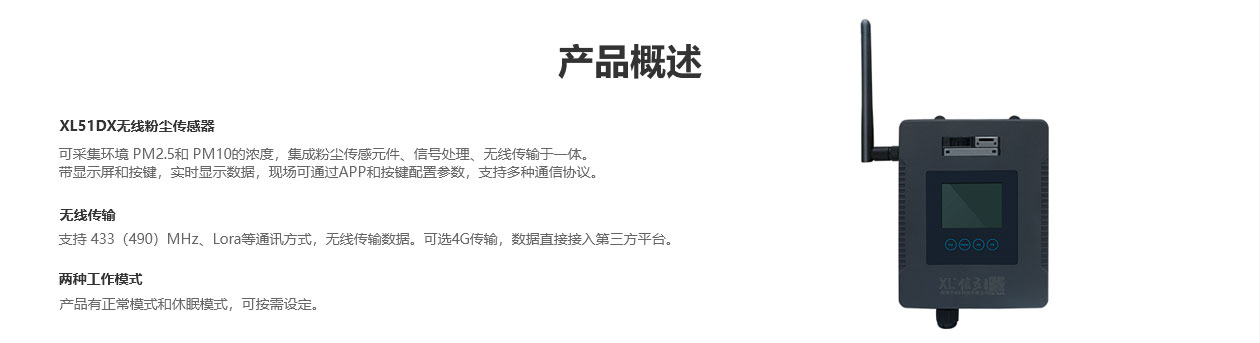 XL51DX無(wú)線粉塵傳感器,可采集環(huán)境 PM2.5和 PM10的濃度,集成粉塵傳感元件、信號(hào)處理、無(wú)線傳輸于一體。帶顯示屏和按鍵,實(shí)時(shí)顯示數(shù)據(jù),現(xiàn)場(chǎng)可通過(guò)APP和按鍵配置參數(shù),支持多種通信協(xié)議。