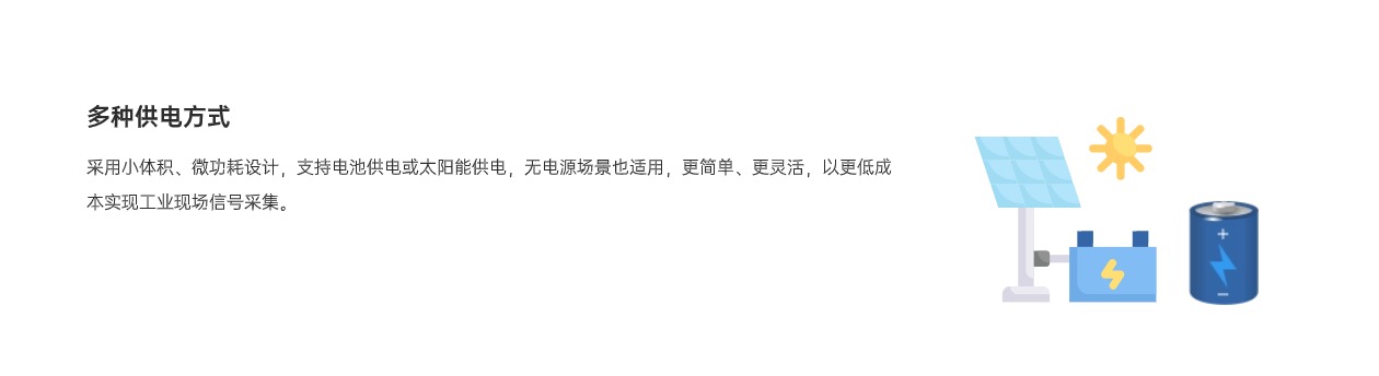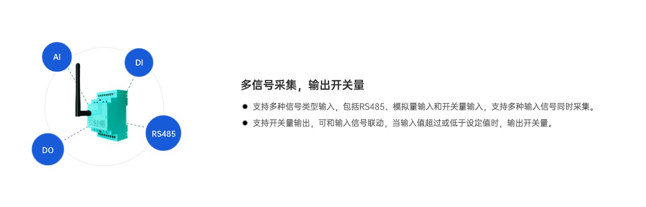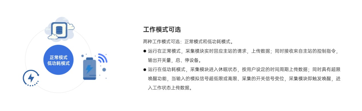 用于監(jiān)測(cè)點(diǎn)分散、數(shù)量少、供電不方便的場(chǎng)景。電池供電,變位、超限觸發(fā)功能,更適用于變送儀表信號(hào)、開(kāi)關(guān)接點(diǎn)信號(hào)采集。