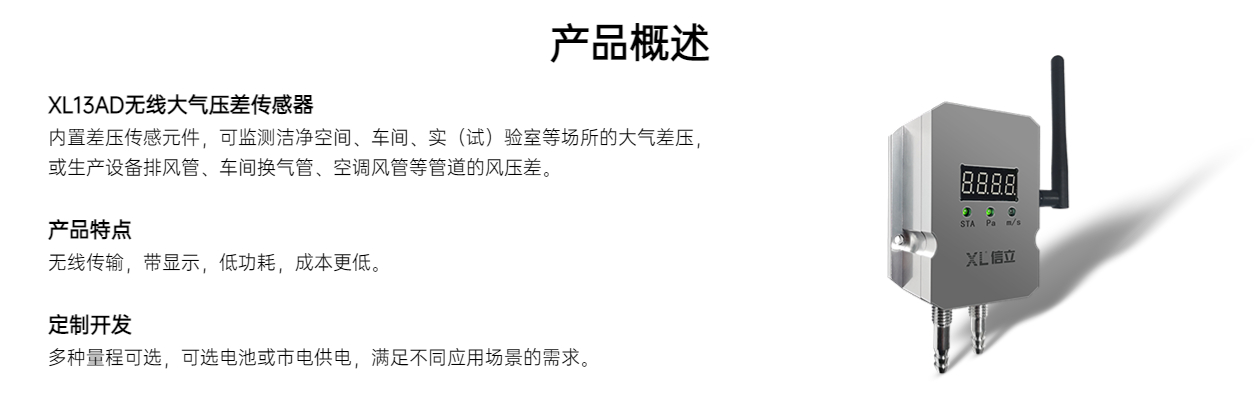 XL13AD智能壓差傳感器,按低功耗、電池供電標準設(shè)計,帶顯示,多種量程可選,體積小,安裝接線簡單、便捷,適應(yīng)不同的場景的需求。