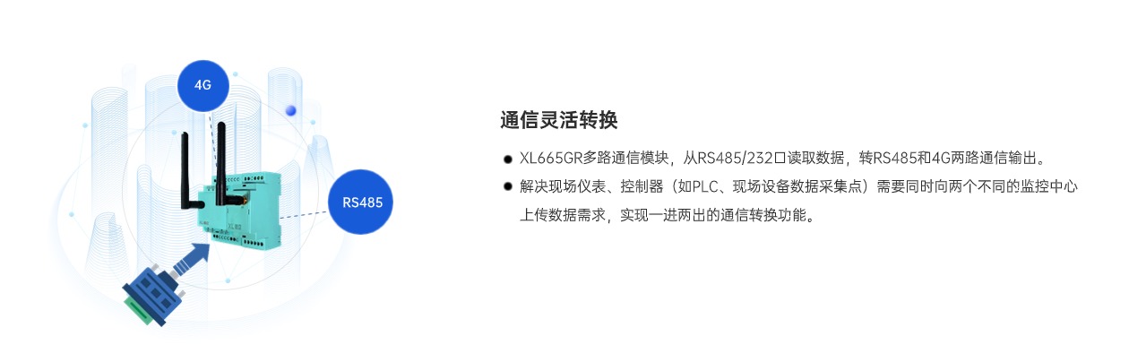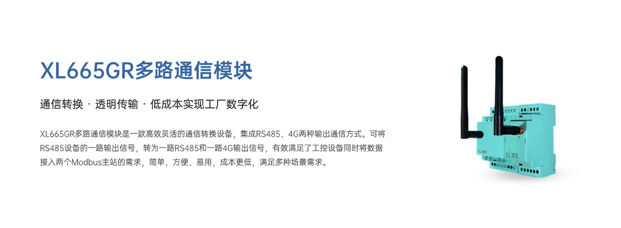 XL665GR多路通信模塊是一款高效靈活的通信轉(zhuǎn)換設(shè)備,可將RS485設(shè)備的一路輸出信號,轉(zhuǎn)為4G和RS485兩路輸出信號,有效滿足了工控設(shè)備同時將數(shù)據(jù)接入兩個Modbus主站的需求,簡單、方便、易用,成本更低,滿足多種場景需求。