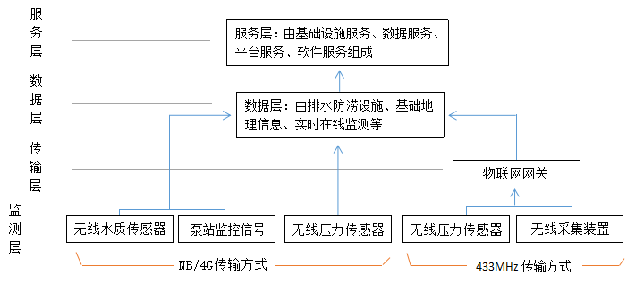 ?2、傳輸層:傳輸層主要有無線采集裝置、無線壓力傳感器、NB、4G、Lora無線傳輸網(wǎng)絡(luò)組成。