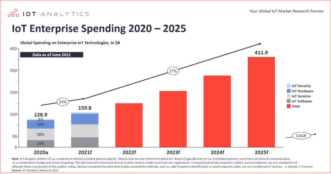 具體到物聯(lián)網(wǎng)行業(yè),2020年,全球物聯(lián)網(wǎng)的連接數(shù)首次超越了非物聯(lián)網(wǎng)連接數(shù),這標(biāo)志著物聯(lián)網(wǎng)發(fā)展達到了一個新的歷史時刻。而物聯(lián)網(wǎng)作為智能時代的新型基礎(chǔ)設(shè)施,其前進的步伐必然不會停歇。據(jù)IoT Analytics公布的調(diào)研數(shù)據(jù)顯示,2020年最終企業(yè)用戶對物聯(lián)網(wǎng)解決方案的總支出達到1289億美元,預(yù)計到2021年底將達到1598億美元(約合1萬億元人民幣)。