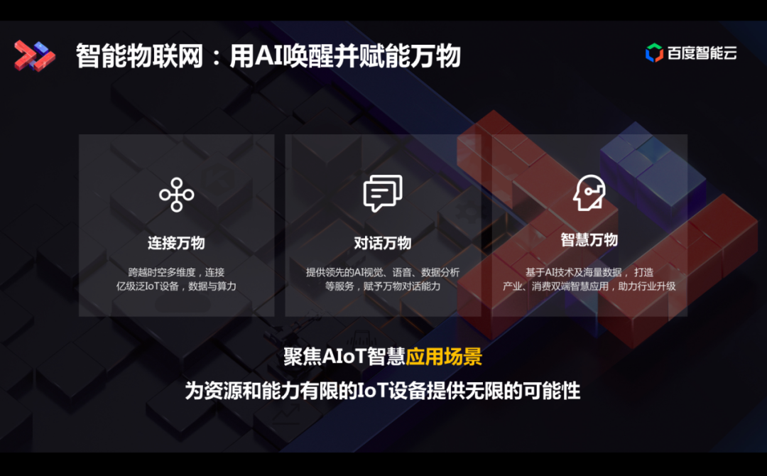“智慧”是指百度智能云基于深厚的AI技術(shù)積累及海量數(shù)據(jù),打造產(chǎn)業(yè)、消費雙端智慧應(yīng)用,將每一個物聯(lián)網(wǎng)終端升級為AIoT設(shè)備。
