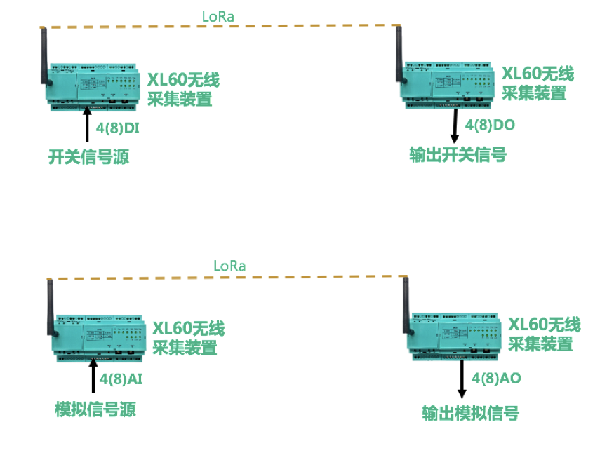 選擇兩臺(tái)XL60無線采集裝置,以一對(duì)一的無線傳輸方式,實(shí)現(xiàn)模擬、開關(guān)信號(hào)無線傳輸:一臺(tái)XL60可配置多個(gè)I/O模塊;