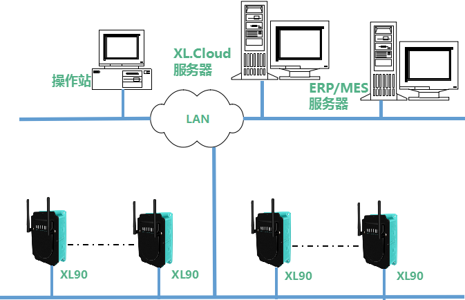 平臺系統(tǒng)的通信網(wǎng)絡,由XL90物聯(lián)網(wǎng)關,企業(yè)局域網(wǎng),和監(jiān)控服務器構成。