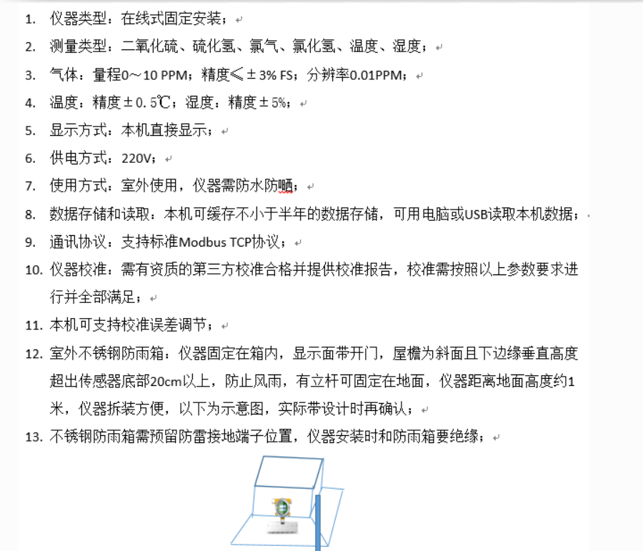戶外箱體配置:建議選擇1套玻璃鋼百葉箱,安裝XL68環(huán)境監(jiān)測(cè)終端及傳感器探頭。建議選擇尺寸足夠的標(biāo)準(zhǔn)產(chǎn)品。