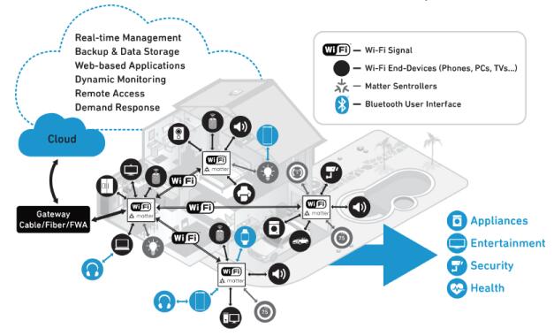 Matter有助于消費類物聯(lián)網(wǎng)互聯(lián)生態(tài)系統(tǒng)輕松實現(xiàn)即插即用,從而簡化智能家居和智能辦公環(huán)境。它在互聯(lián)網(wǎng)協(xié)議之上提供一個層,其中包括一組適用于所有Matter連接設(shè)備的預(yù)定義方案。這使得 Matter 設(shè)備能夠了解它們正在與什么類型的對象進(jìn)行通信,以及這些對象有什么樣的功能。Matter 使物聯(lián)網(wǎng)終端設(shè)備或節(jié)點能夠與各種 Wi-Fi 網(wǎng)絡(luò) pod 輕松通信。