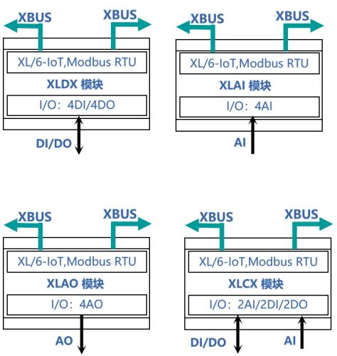 I/O模塊可選:XLDX(4DI/0-4DO)、XLAI(0-4AI)、XLAO(0-4AO) 。