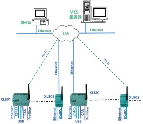 XL80通信主機(jī),從設(shè)備通信接口,讀取設(shè)備或系統(tǒng)的運行數(shù)據(jù),通信協(xié)議轉(zhuǎn)換處理后,再通過EthernetWi-Fi,接入LAN,轉(zhuǎn)發(fā)數(shù)據(jù)至MES。