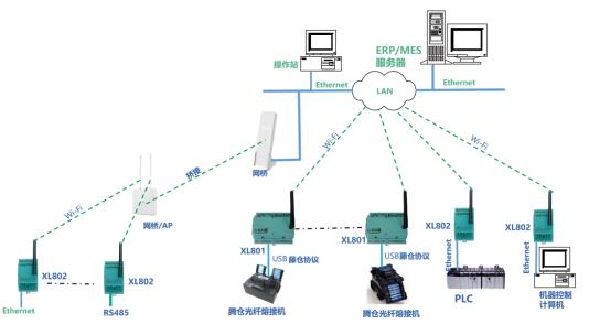 對于安裝分散,離LAN接口遠(yuǎn)的設(shè)備,設(shè)計XL80安裝在LAN口附近接入局域網(wǎng),選擇XL66無線轉(zhuǎn)換器,連接設(shè)備RS485/RS232接口,實現(xiàn)設(shè)備無線聯(lián)接XL80通信主機(jī)。