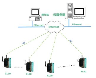 對(duì)于安裝分散、距離遠(yuǎn)的監(jiān)測(cè)點(diǎn),可通過XL90網(wǎng)關(guān)構(gòu)建一個(gè)小的物聯(lián)網(wǎng)數(shù)據(jù)采集系統(tǒng)。網(wǎng)關(guān)無線讀取區(qū)域內(nèi)各監(jiān)測(cè)點(diǎn)的數(shù)據(jù),通過4G推送數(shù)據(jù)至云平臺(tái)。