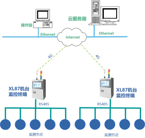 采集終端的數(shù)據(jù)通過RS485將數(shù)據(jù)傳輸至XL87監(jiān)控終端,XL87監(jiān)控終端通過4G通信將環(huán)境數(shù)據(jù)上傳至云平臺,平臺軟件可向操作站、監(jiān)控看板、現(xiàn)場監(jiān)控觸摸屏推送數(shù)據(jù)。