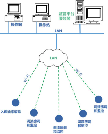 涂裝油漆調(diào)和監(jiān)管系統(tǒng),由監(jiān)管平臺(tái)服務(wù)器、油漆調(diào)和操作監(jiān)控終端、電子秤、油漆編碼終端、操作站等構(gòu)成,通過(guò)工廠內(nèi)的局域網(wǎng)(WI-FI)進(jìn)行通信連接。
