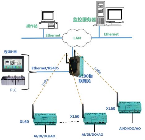 方案一:XL60無線采集裝置采集的現(xiàn)場設(shè)備數(shù)據(jù),采用LoRa無線傳輸方式,傳輸至XL90物聯(lián)網(wǎng)關(guān),經(jīng)協(xié)議轉(zhuǎn)換后將數(shù)據(jù)通過Ethernet或RS485上傳至監(jiān)控平臺(tái)、PLC、觸摸屏、控制器等設(shè)備。