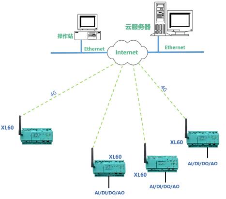 方案三:對于位置偏遠(yuǎn)或安裝分散的設(shè)備運(yùn)行參數(shù),如管網(wǎng)、管溝的壓力、溫度、液位、流量、氣體濃度等信號(hào),XL60無線采集裝置可采用4G通信將采集的數(shù)據(jù)直接上傳至云平臺(tái)。