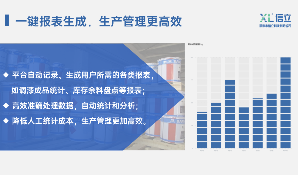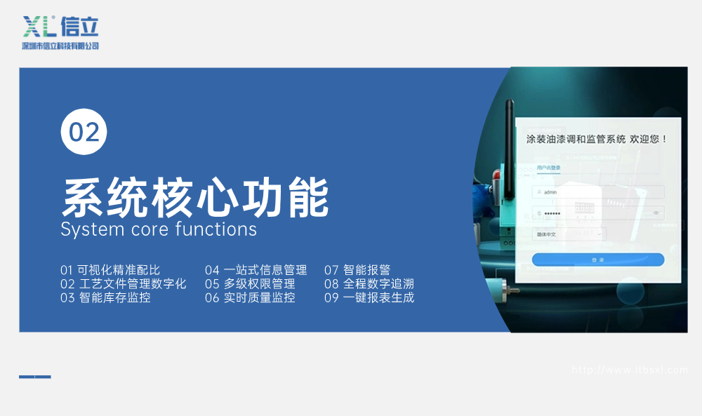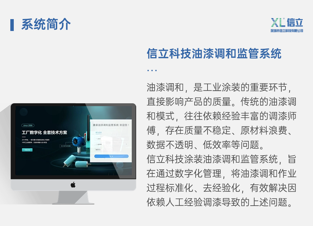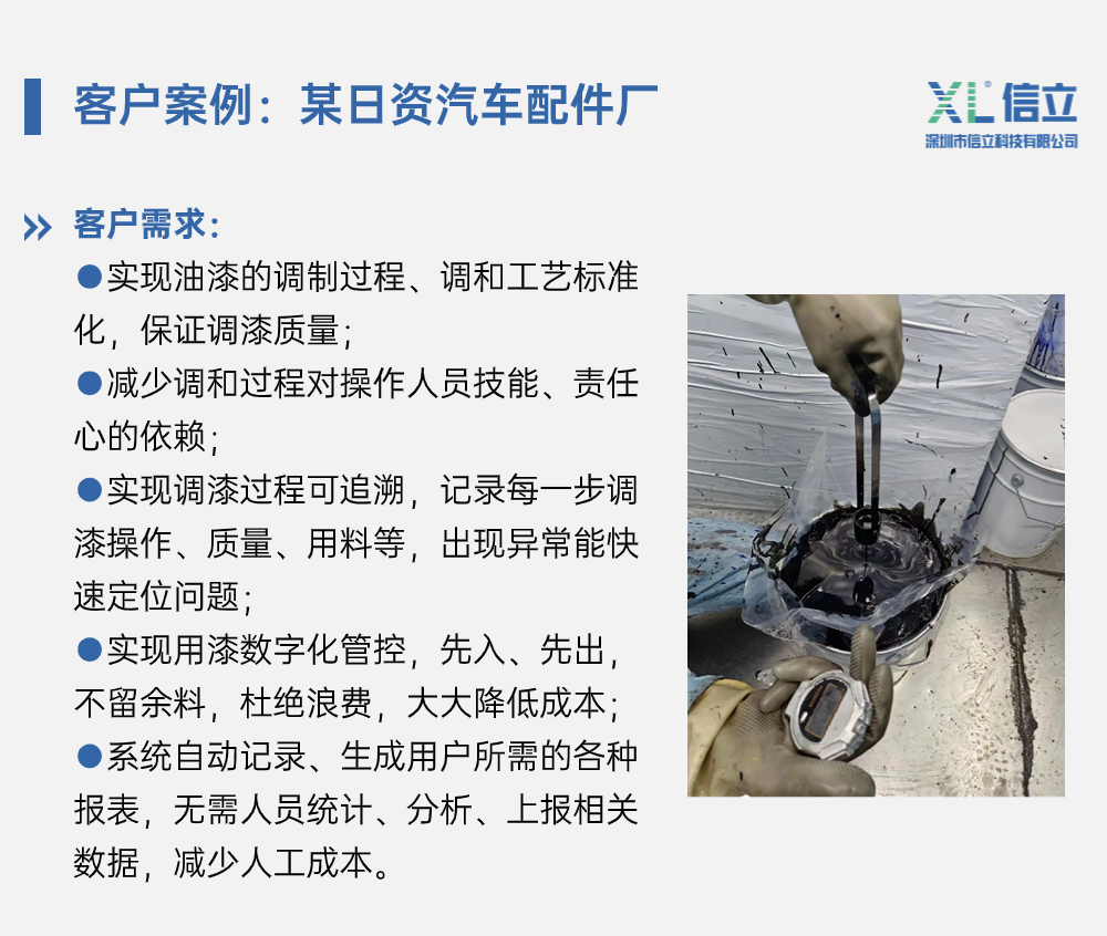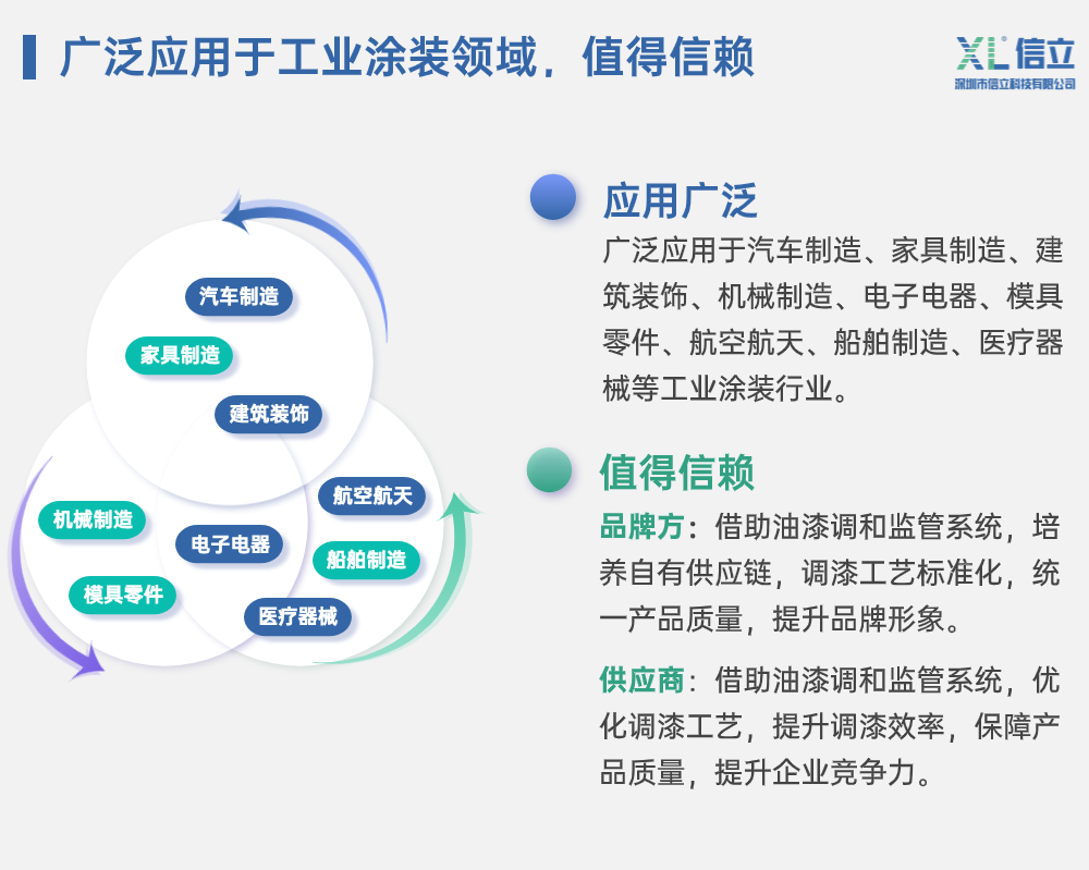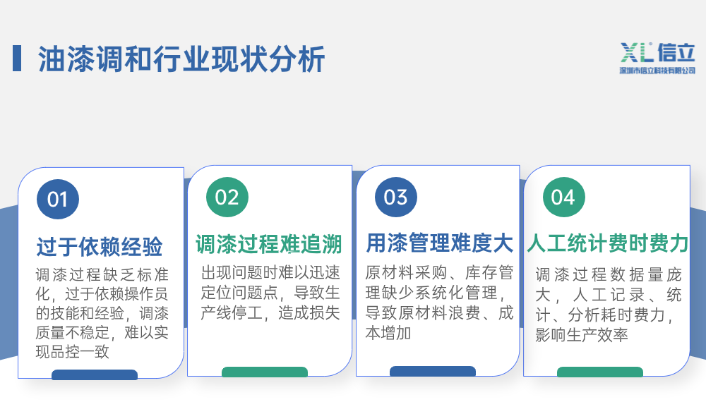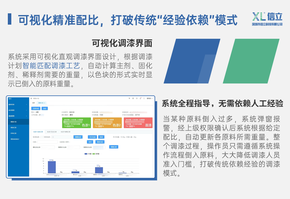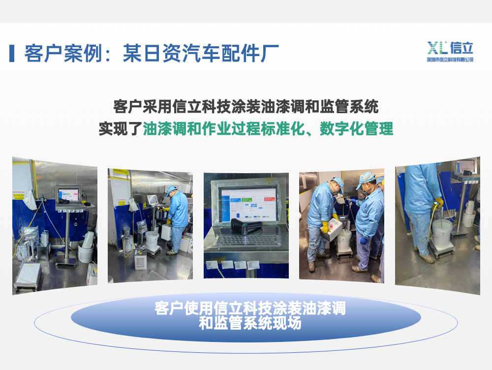 信立科技涂裝油漆調和監(jiān)管系統(tǒng),旨在通過數(shù)字化管理,將油漆調和作業(yè)過程標準化、去經驗化,有效解決因依賴人工經驗調漆導致的上述問題。