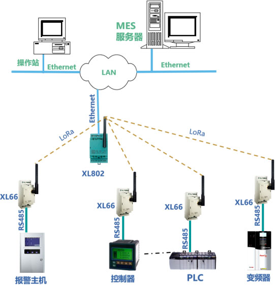 XL66無線轉(zhuǎn)換器通過RS485/RS232接口讀取設(shè)備數(shù)據(jù),設(shè)計(jì)XL802通信主機(jī)安裝在LAN口附近接入局域網(wǎng),并通過LoRa無線接口,從XL66無線讀取設(shè)備的運(yùn)行數(shù)據(jù),通信協(xié)議轉(zhuǎn)換處理后,通過Ethernet,轉(zhuǎn)發(fā)數(shù)據(jù)至MES。