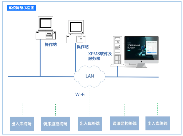 信立智能調(diào)漆系統(tǒng)XPMS由服務(wù)器及平臺軟件、調(diào)漆終端、出入庫終端、Wi-Fi網(wǎng)絡(luò)構(gòu)成。