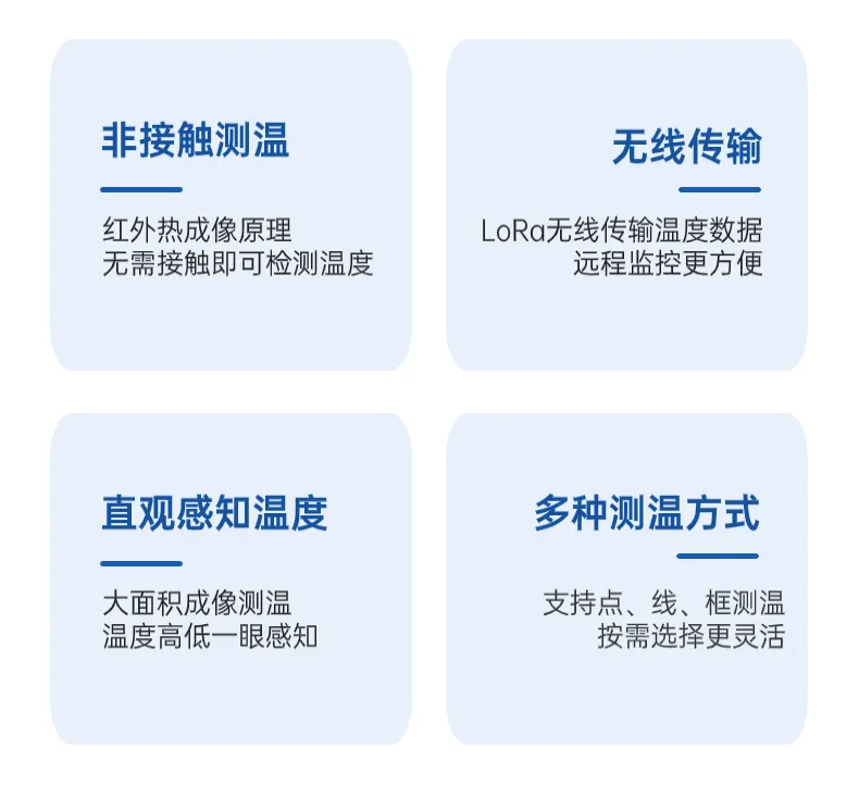 采用XL16IT無(wú)線紅外熱成像測(cè)溫傳感器,實(shí)現(xiàn)對(duì)配電柜、變壓器等電氣設(shè)備母線、銅排、電纜連接部位的非接觸式溫度監(jiān)測(cè)。配置氧化釩非制冷型探測(cè)元件,可同時(shí)監(jiān)測(cè)10個(gè)點(diǎn)、10個(gè)框、1條線的溫度,測(cè)溫范圍廣、精度高